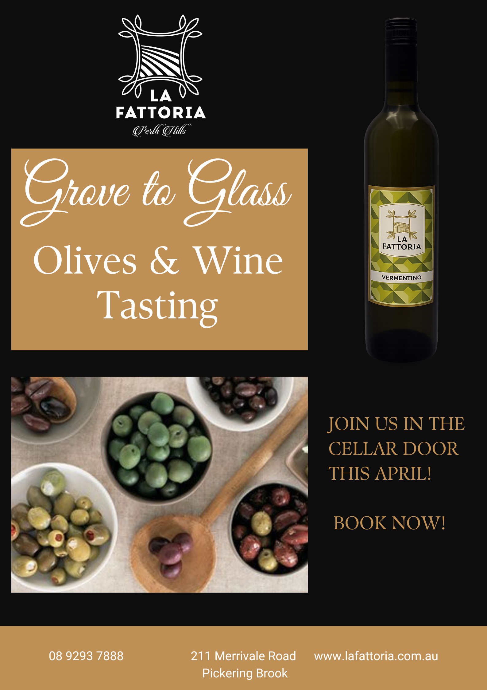 Join Eric at La Fattoria for a guided wine tasting that celebrates the timeless pairing of olives and wine. Guests will taste five La Fattoria wines, each thoughtfully paired with olives prepared five different ways — from bright and briny to slow-marinated and richly savoury. Hosted at our rustic Perth Hills cellar door, this interactive tasting explores how salt, oil, herbs and acidity influence the way a wine tastes. Along the way you’ll discover why olives have been a natural companion to wine around Mediterranean tables for generations. Tastings are served responsibly, with the five pairings amounting to approximately one standard drink in total. Perfect for curious wine lovers, food enthusiasts, and anyone wanting to experience something a little different. Please note: we are unable to cater for dietary requirements.