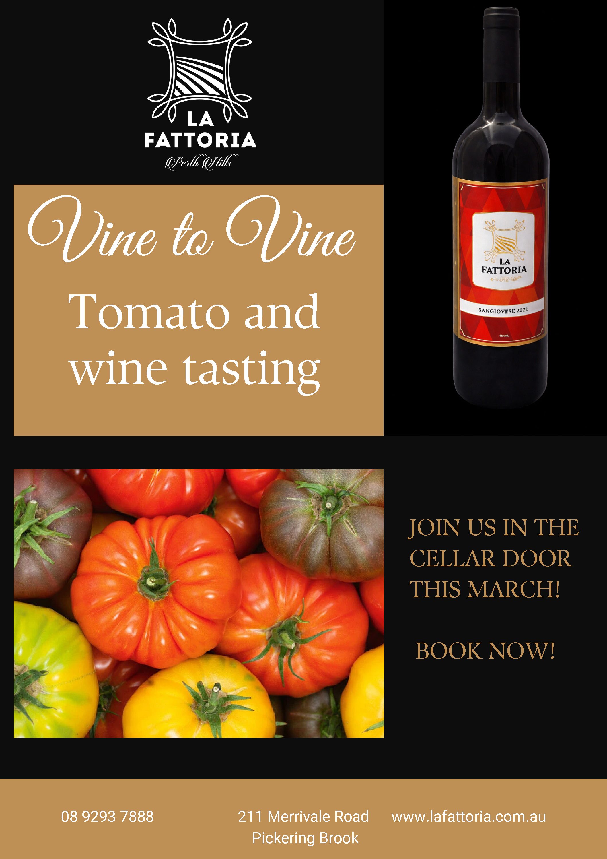 Join Eric at La Fattoria for a guided wine tasting that explores the powerful relationship between wine and tomatoes. Guests will taste five La Fattoria wines, each thoughtfully paired with tomatoes prepared five different ways—from fresh and vibrant to slow-cooked and richly savoury. This relaxed, educational experience highlights how acidity, sweetness, texture, and umami in tomatoes can transform the way a wine tastes. Set in our rustic cellar door, it’s an engaging way to deepen your understanding of food and wine pairing while enjoying some of La Fattoria’s alternate Italian wines grown here in the Perth Hills. Tastings are served responsibly, with the five pairings amounting to approximately one standard drink in total. Perfect for curious wine lovers, food enthusiasts, and anyone wanting to experience something a little different. Please note: we are unable to cater for dietary requirements.